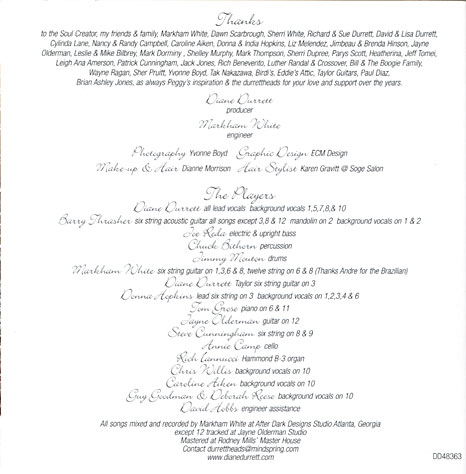 October 2003- Diane Durrett was in the studio recording her latest CD release- CHILL. Engineered by Markham White and producted by Diane Durett, CHILL has the best Atlanta musicians! Barry Trasher on guitar, Joe Reda on bass, Chuck Bithorn on percussion, Jimmy Mouton on drums and Rich Iannucci on organ. Wow! It doesn't get any better than that! Diane is a perfectionist in the studio and the results are worth it! Check out mp3's of her tracks off her latest CD. To purchase the CD go to: "CHILL".